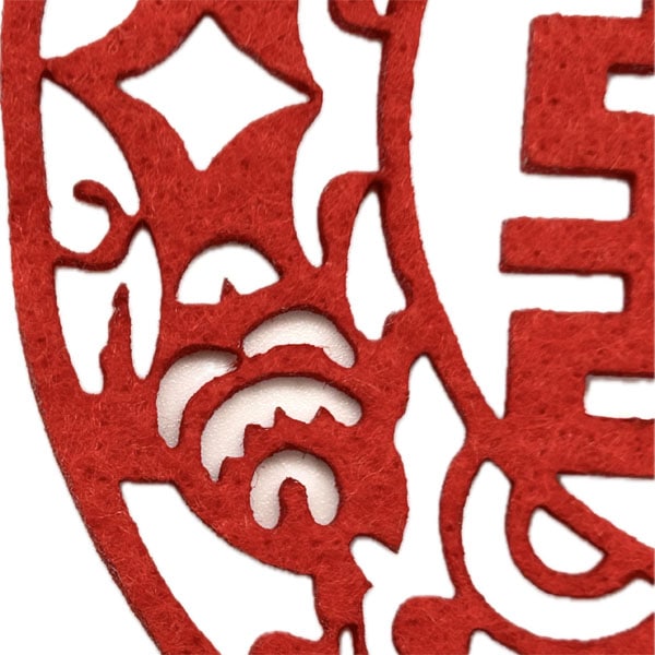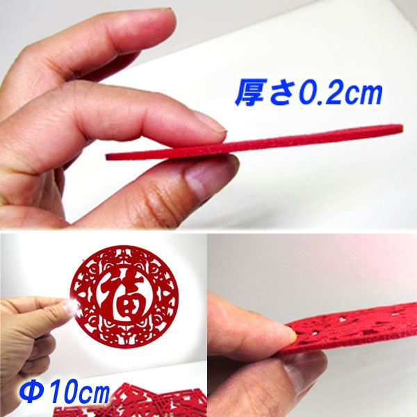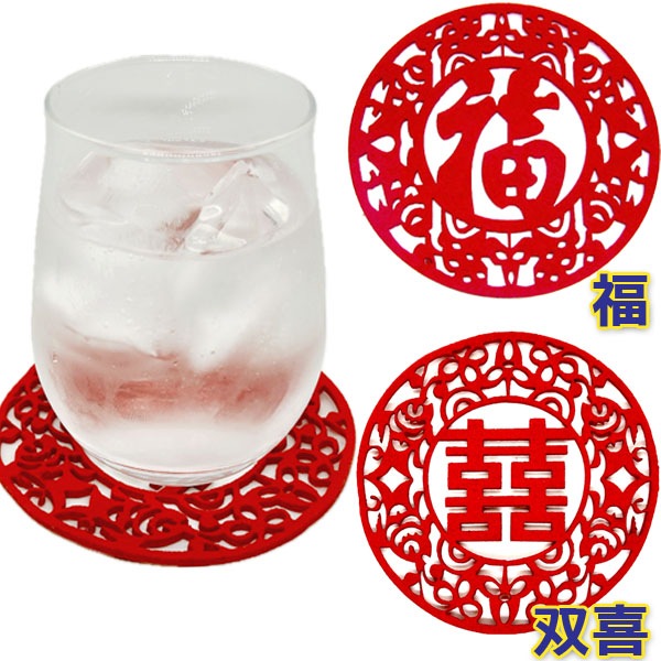 オメデタイ文字が中華フェルトコースターに!福字&双喜!柔らかくコシのあるフェルト素材で作られています。レーザーカットされたフェルトコースターは細かいデザインなのにキレイにズレなくカット成形されています。おめでたい席やパーティーでの小物演出、中華店、飲み屋etcなど、どこで使っても絵になるコースターです。福字コースターはその名の通り【福】の字をスタイリッシュなデザインと中華模様であしらわれています。双喜は喜ぶという字を2つ並べて「喜喜」とし、喜びを表す文字として使われています。このコースターには魚などもデザインされており、 非常に凝ったモノとなっています。お求めやすい価格なので、気軽に使ってみてはいかがですか。 ■サイズ:10.5cm×厚さ:0.3cm■材質:フェルト■中国製■ネコポス便:25枚まで可能≫(制限有) 全国一律250円(選択可能)(ネコポス便はポスト投函なので日付やお時間指定ができません) ≫中国雑貨がいっぱい↑クリックしてね。↑ ※中国直輸入品の為、多少の作りの粗さ等があります。