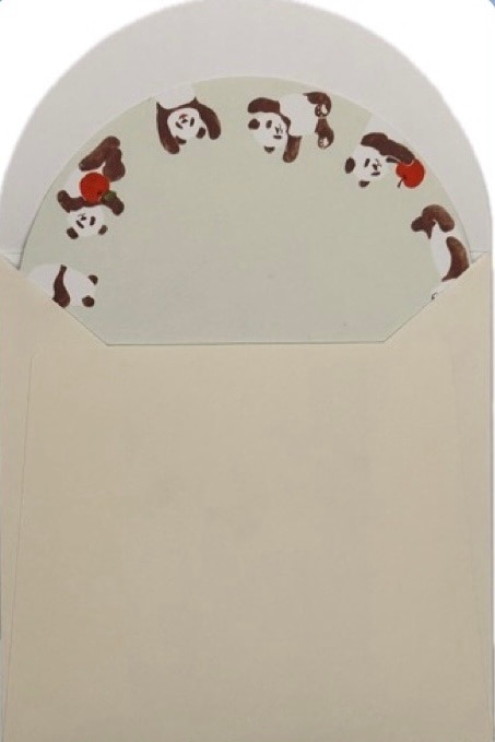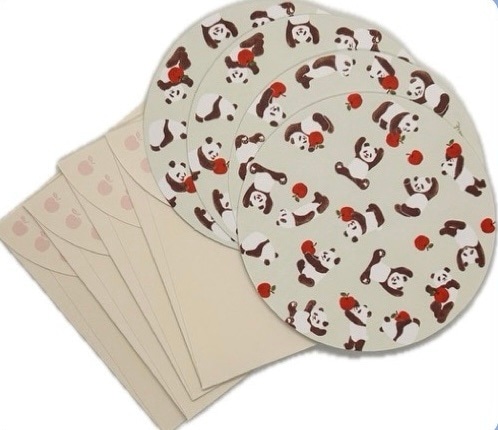 りんごを抱えたパンダたちがぐるりと囲む、キュートな丸型デザインの「ミニマルメッセージカード」。