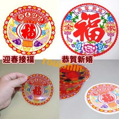 透明シートにカラフルで縁起の良さそうな賀紙デザインがプリントされています。
