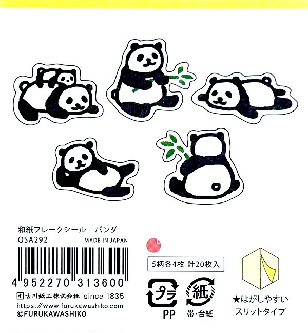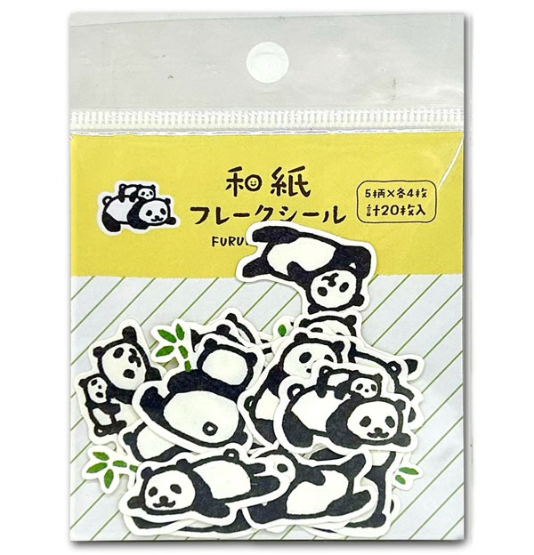 ほっこり癒しの“和パンダ”シール!のんびりした姿がたまらない、ゆる〜いパンダたちのフレークシール。5種のデザインはどれもゆるくて可愛い。各4枚ずつはいっているので、手帳デコやお手紙、スマホケースのアレンジにもぴったり。和紙素材ならではのやさしい質感で、貼るだけでホッとするかわいさになります。日本製ならではのしっかりしたクオリティもオススメポイントです。■サイズ:8cm×7.5cm(台紙)、約2cm〜2.5cm横×1.5cm〜2.5cm縦(パンダ)■5デザイン×4枚(20枚)■日本製■ネコポス便:全国一律250円(選択可能)(ネコポス便はポスト投函なので日付やお時間指定ができません) ≫パンダ雑貨がいっぱい↑クリックしてね。↑【※必ずお読み下さい】 国内メーカー取り扱い商品ですので、万が一不良等ありましたらタグやパッケージ記載のメーカーへご連絡をお願い致します。