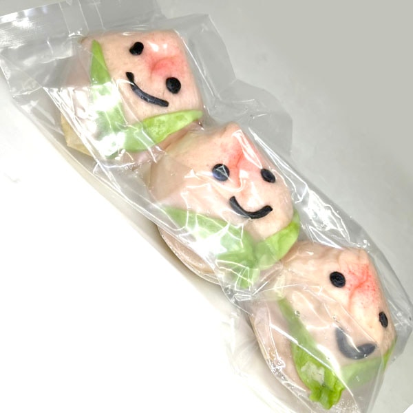 ■原材料:小麦粉、黒胡麻あん、上白糖、白桃、ベーキングパウダー、ドライイースト、ラード、赤色102号、黄色4号、青色1号