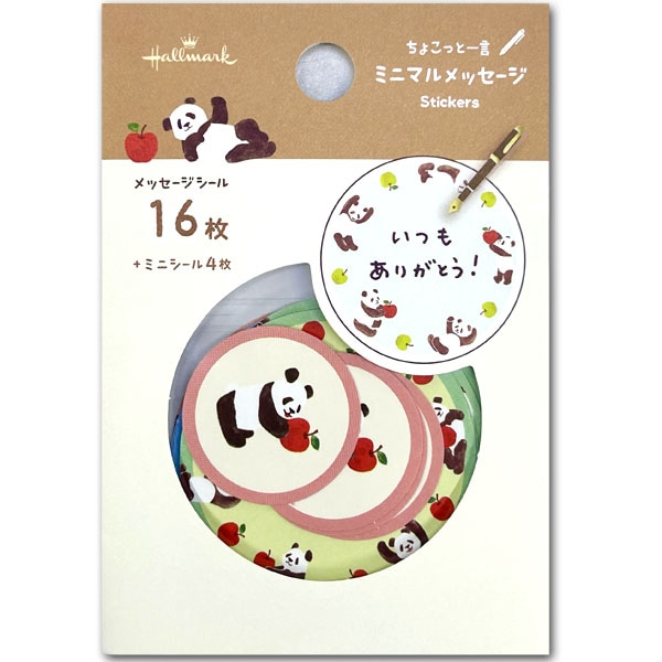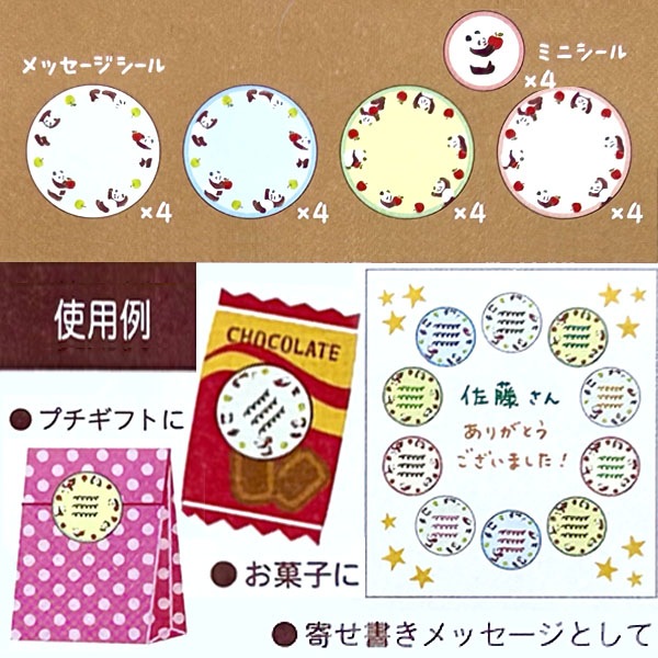 りんごを持ったパンダがかわいい、丸型のメッセージシール。