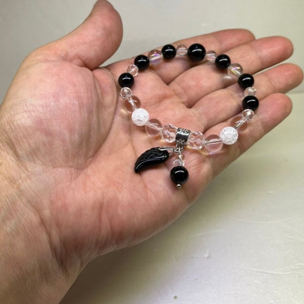 ブレスレットに付いている羽飾りと石が、ゆらゆらと動いてとても可愛らしいです。