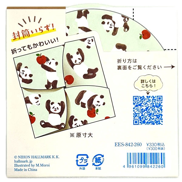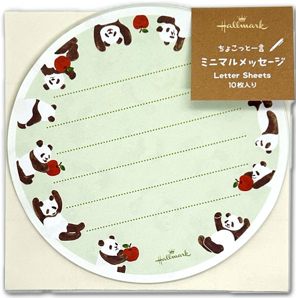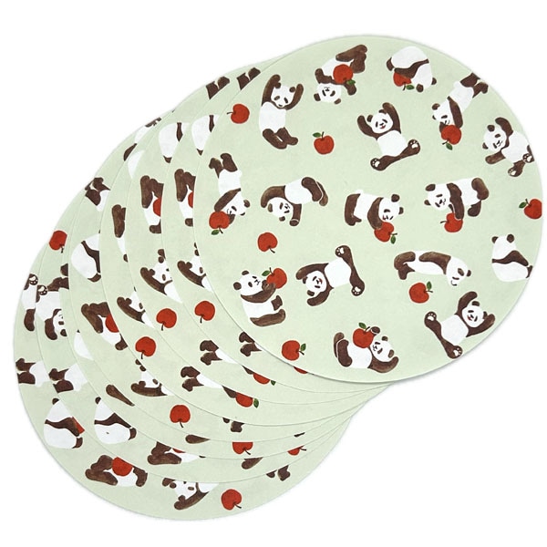 りんごを抱えたパンダたちがぐるりと囲む、キュートな丸型デザインの「ミニマルメッセージ」付箋です。