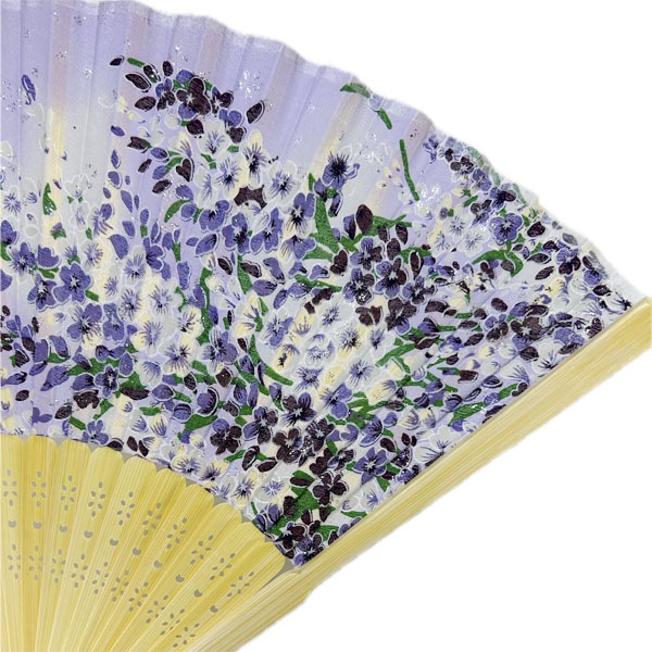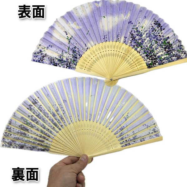 扇子には美しい蝶々とラベンダーの花が描かれており、持つだけで華やかな気分にさせてくれます。