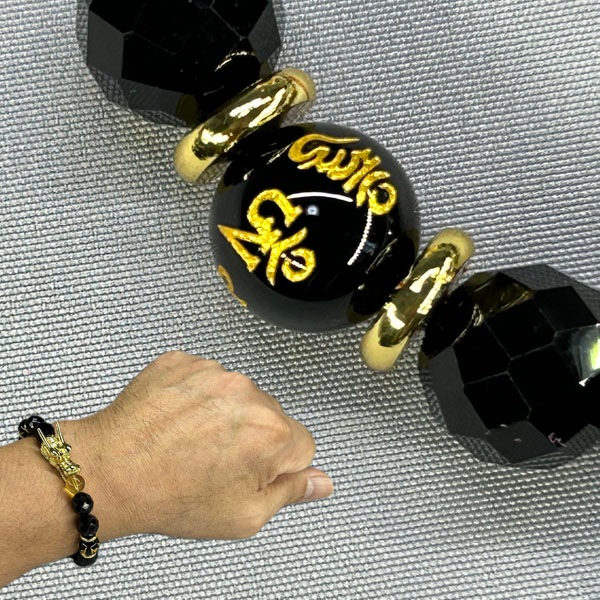 ■石:10mm×14石(オニキス玉)、Φ12mm×18mm(文字入りオニキス)、4石、8mm×4(金円)、全長2.6mm×幅10mm×高さ12mm(龍)、Φ8mmΦ5mm(黄玉)