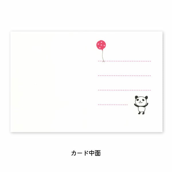 やさしいタッチで描かれた愛らしいパンダが、赤い風船を持って微笑むミニグリーティングカード。