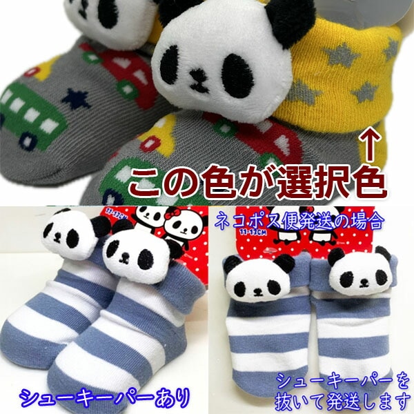 乗り物好きでパンダ好きなら喜ぶベビーソックス!乗り物大好きな男の子なら、喜んで靴下を履いてくれそう!パンダ好きなお母さんなら、赤ちゃんが履いてる姿の可愛さに癒されちゃいます。足裏には星型の滑り止めが付いているから、安心して歩けます。自分の子供に履かせてもいいけど、親戚の子や友達の子供にプレゼントしてもいいですね。 ■サイズ:11cm〜13cm■素材:綿、ポリエステル、ポリウレタン、ナイロン■中国製■ネコポス便:全国一律250円(選択可能)(ネコポス便はポスト投函なので日付やお時間指定ができません)※重要:ネコポス配送のためシューキーパーを外して送ります。ご了承ください。≫パンダ雑貨がいっぱい↑クリックしてね。↑※国内メーカー品ですので不良等ありましたら、記載のメーカーへご連絡をお願い致します。