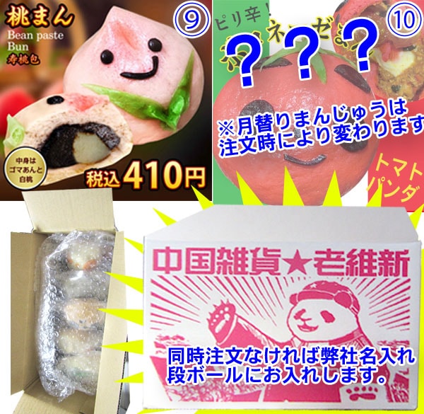 老維新の美味しさを全部集めた10個セットがオススメ!横浜中華街で大人気の老維新パンダまん。パンダまんは種類も多く、どれも可愛くて美味しいからどれを選ぶか迷っちゃう。そんなお客様からのお声に応えて、出しました「パンダまん福袋セット」です。パンダまんの全ラインナップ9種類と月替わりの限定まん1種類で全部で10種類!コレを選べば老維新のお饅頭を全部制覇できます。ただし「初回限定」ということで、1回限りの購入とさせていただきます。各お饅頭を食べてみて、お気に入りのお饅頭を探し出してみてください。■老維新セレクト・10個セット■●パンダまん●肉まんパンダ●ブタ角煮まん●あんパンダまん●野菜パンダまん●イチゴパンダまん●激辛パンダまん●桃まん●フカヒレまん●限定まん
